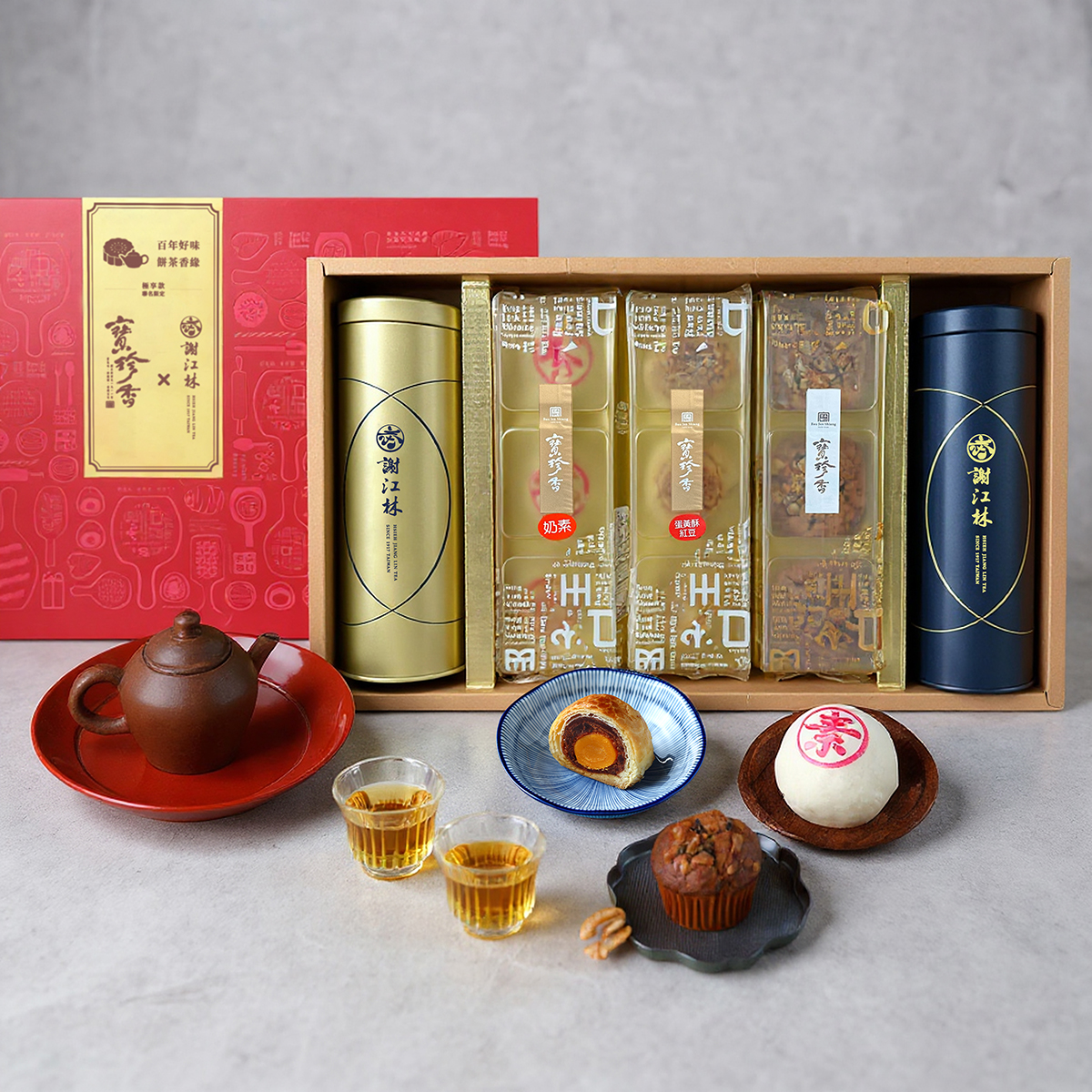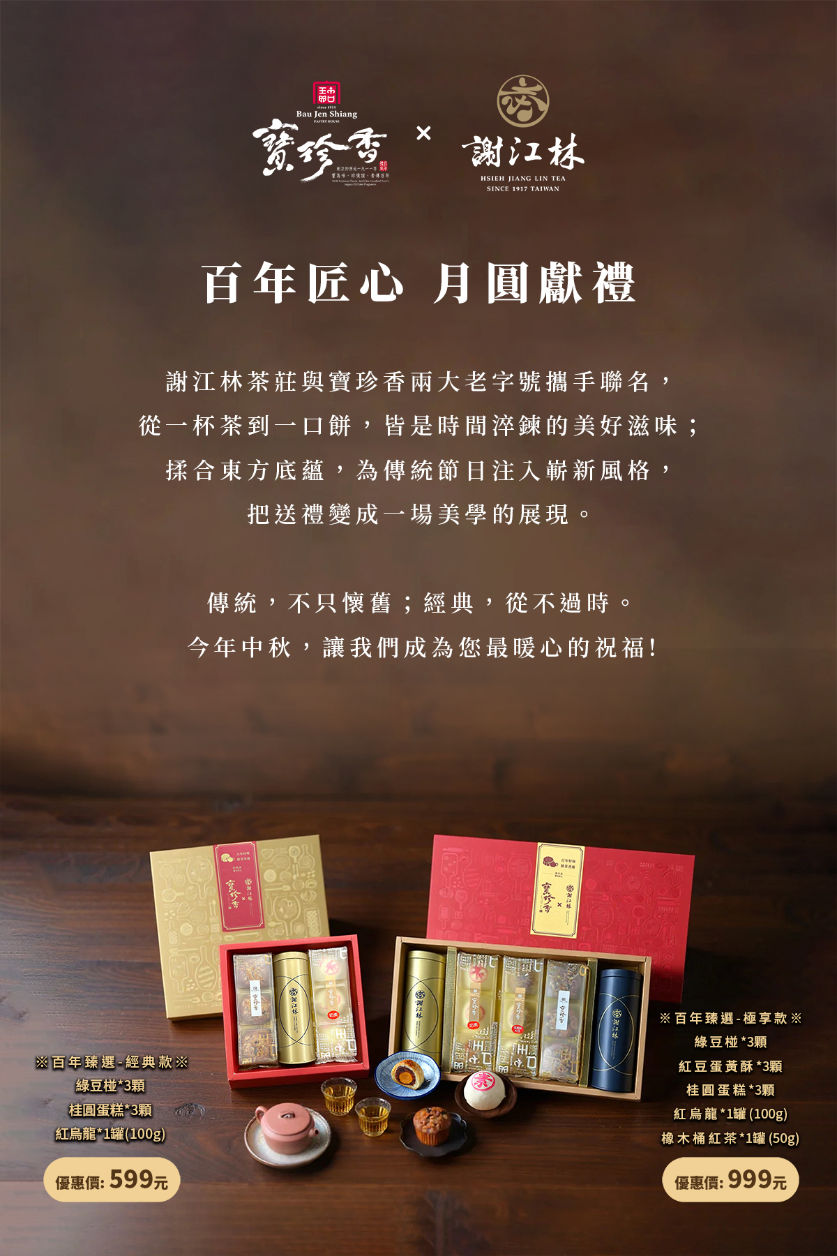 謝江林茶莊與寶珍香兩大老字號攜手聯名, 從一杯茶到一口餅,皆是時間淬鍊的美好滋味; 揉合東方底蘊,為傳統節日注入嶄新風格, 把送禮變成一場美學的展現。 傳統,不只懷舊;經典,從不過時。 今年中秋,讓我們成為您最暖心的祝福!